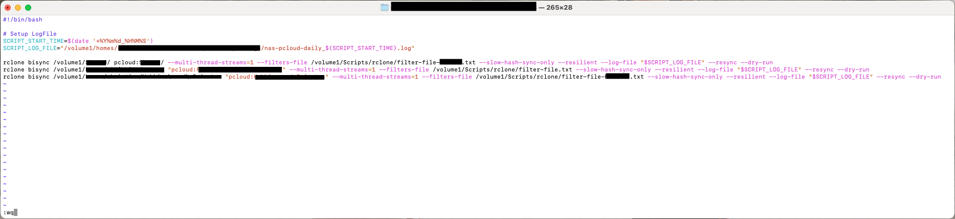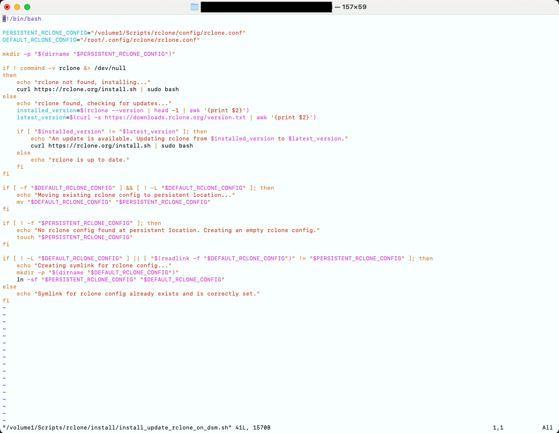 Mit i kannst du direkt in den Insert Mode wechseln und dann kann es losgehen. Wie gesagt, das sind jetzt sehr individuelle rclone Commands zum Kopieren, Synchronisieren, bidirektionalem Synchronisieren, Löschen… was auch immer du regelmäßig machen möchtest. Starte in der ersten Zeile mit dem Hash-Bang für bash #!/bin/bash und dann starte darunter, deine rclone Kommando-Abfolge zu notieren. Hier mein File als Beispiel, deins kann gänzlich anders aussehen.